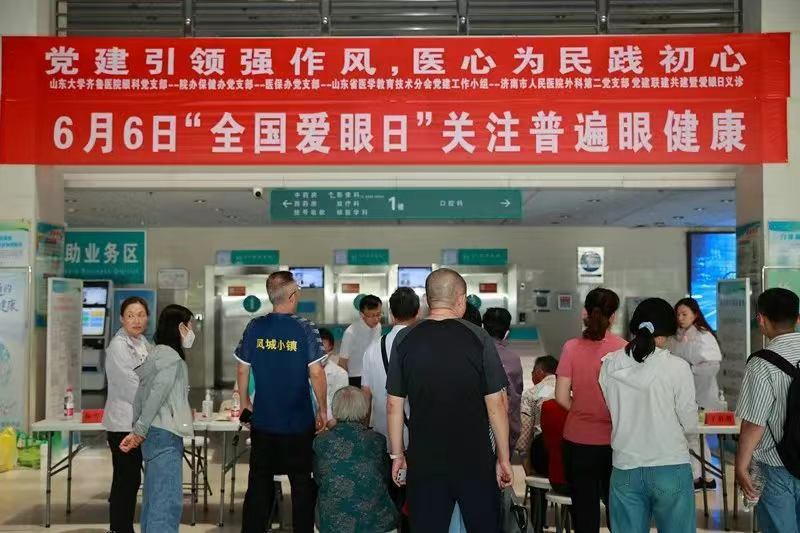 爱眼日义诊环节,党员医生们佩戴党徽,在济南市人民医院的协助下,为基层社区居民提供免费的眼科健康检查与咨询服务。此次义诊活动严格按照规定进行,避免诱导检查或开具处方药品,仅提供专业的健康指导,确保每位参与居民都能在公平、公正的环境下获得健康关怀。义诊现场,党员医生们耐心细致地解答群众健康问题,赢得了居民们的高度赞誉。