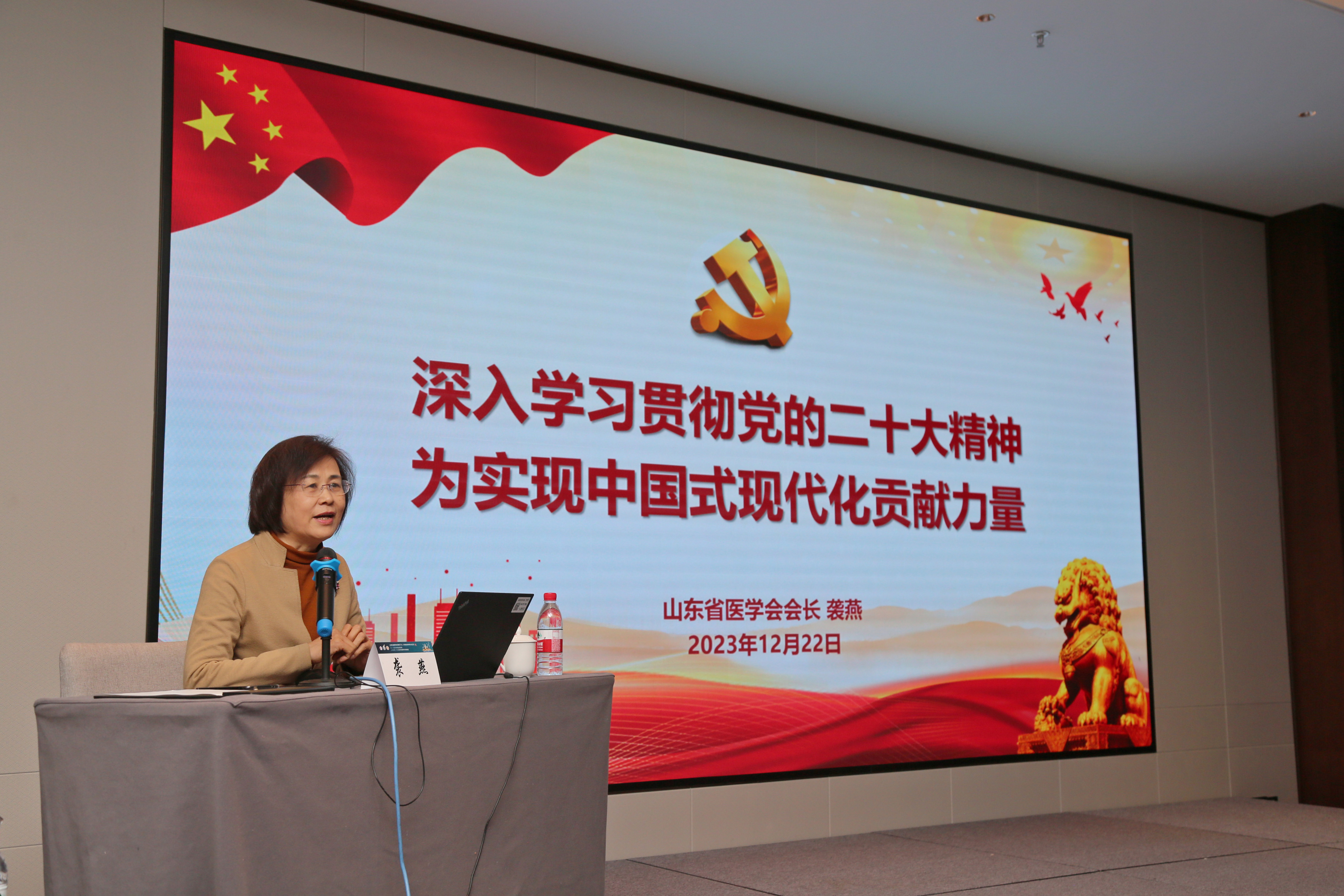 为贯彻落实《山东省医学会2023年度党建工作实施方案》《山东省医学会关于加强新时代党建工作的意见》等文件的要求,2023年12月22日,山东省医学会放射学分会党建工作小组在济南召开会议,山东省医学会党建工作领导小组组长、理事会会长袭燕应邀讲授专题党课。放射学分会党建小组成员及放射学分会全体委员、各学组组长及副组长、青年学组委员等130余人参加会议,分会党建工作小组组长、放射学分会主任委员王光彬教授主持会议。