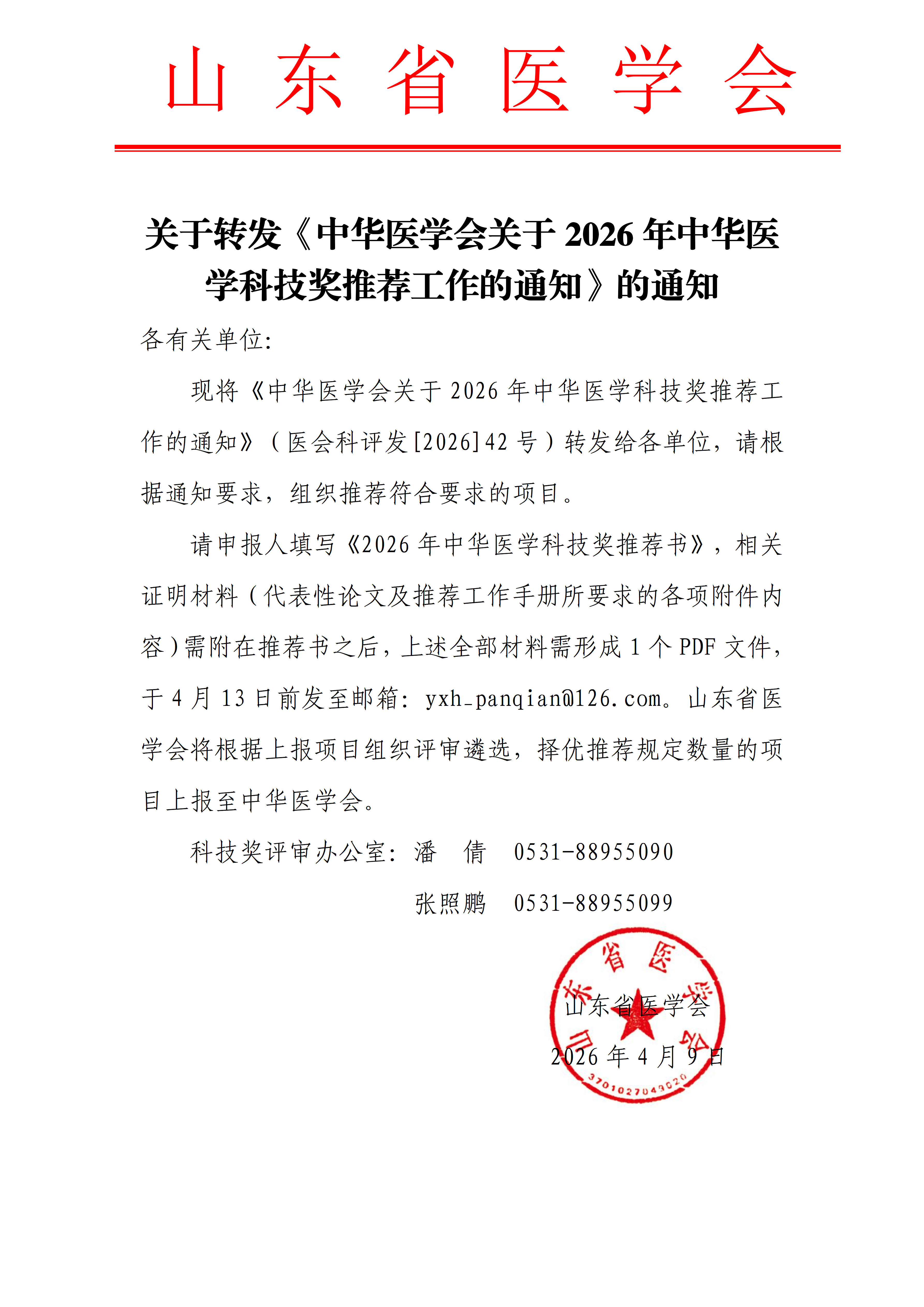 关于转发《中华医学会关于2026年中华医学科技奖推荐工作的通知》的通知
