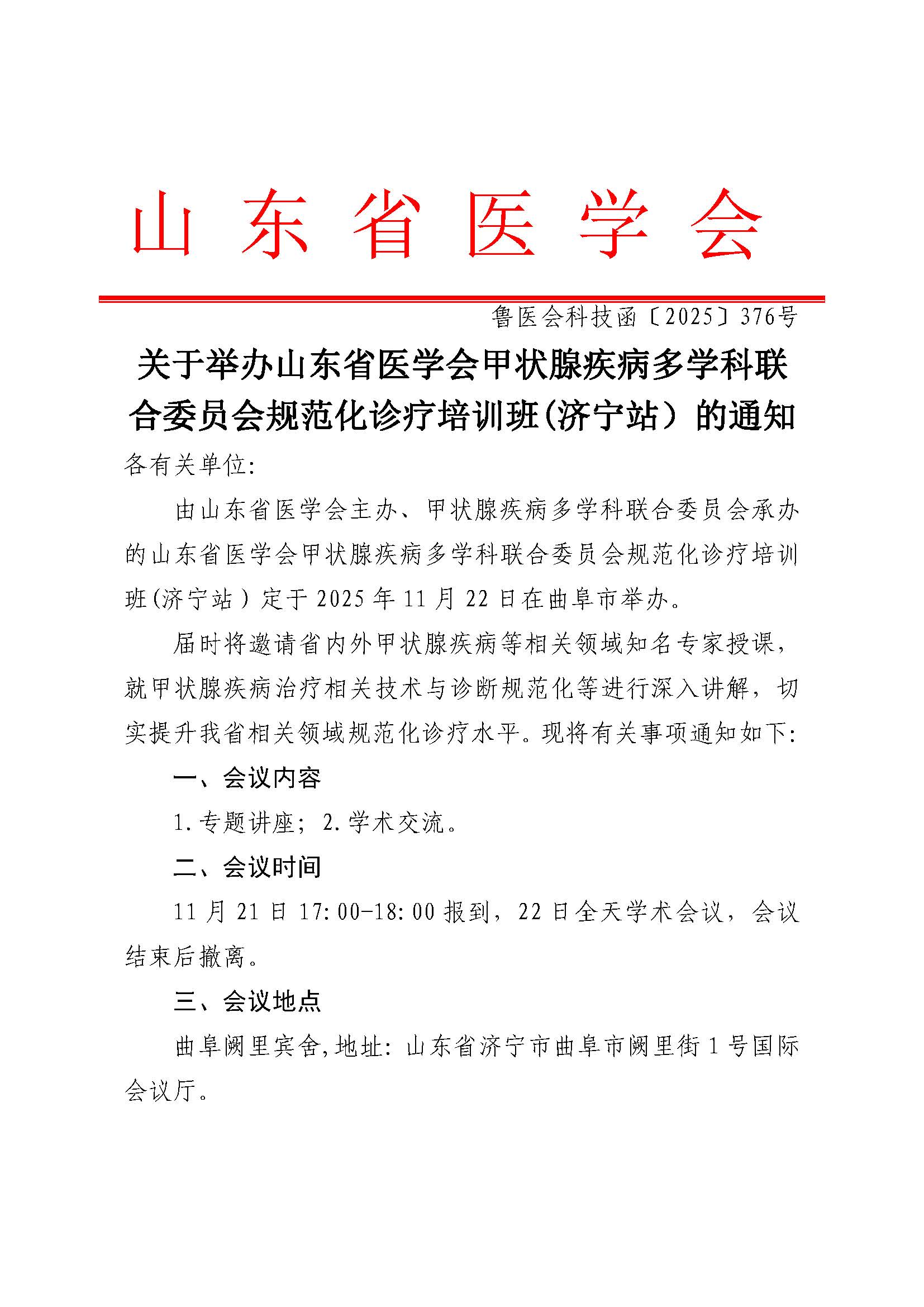 关于举办山东省医学会甲状腺疾病多学科联合会规范化诊疗培训班(济宁站)的通知