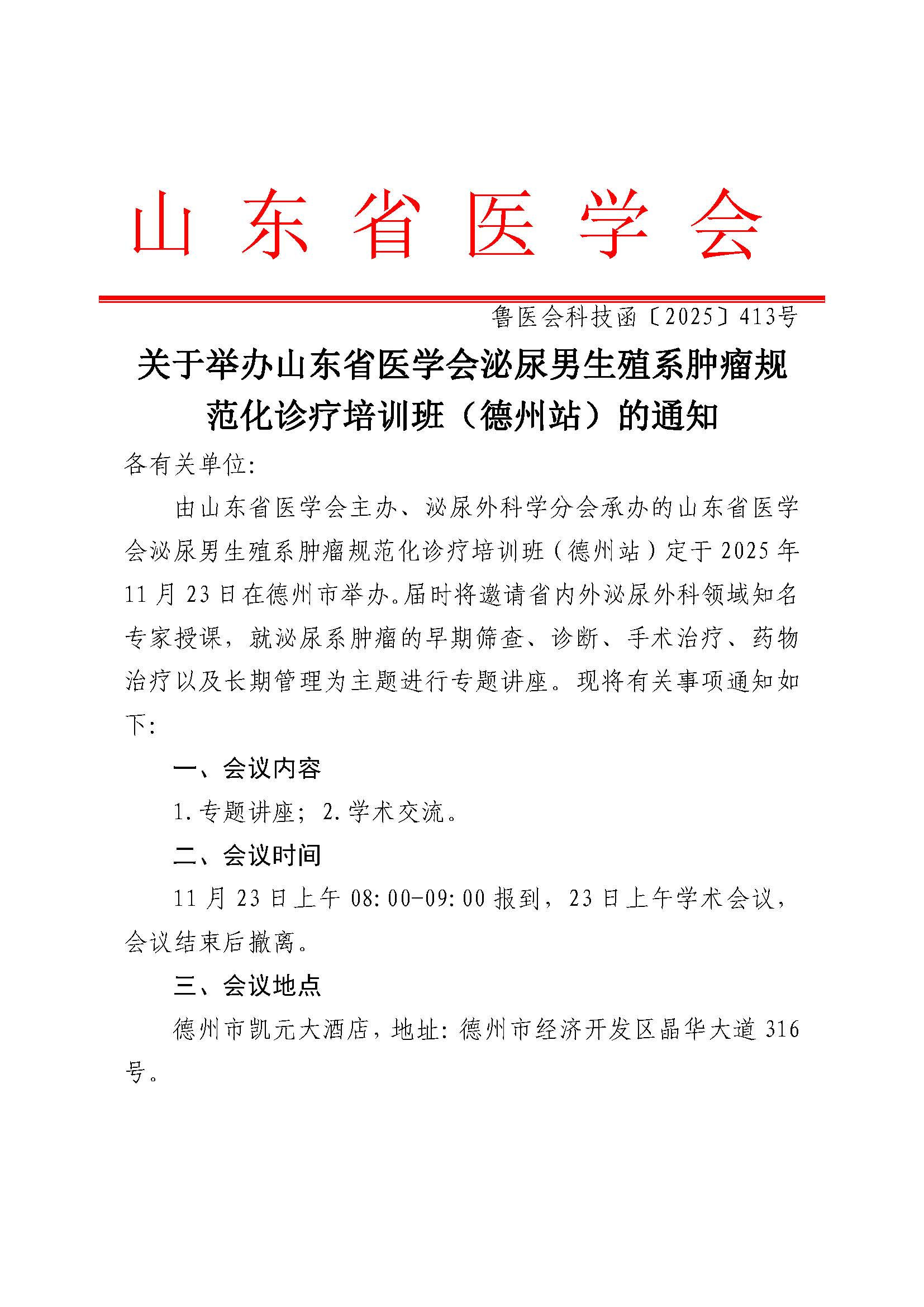 关于举办山东省医学会泌尿男生殖系肿瘤规范化诊疗培训班(德州站)的通知