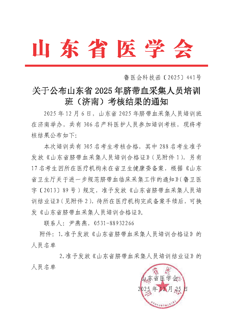 关于公布山东省2025年脐带血采集人员培训班(济南)考核结果的通知