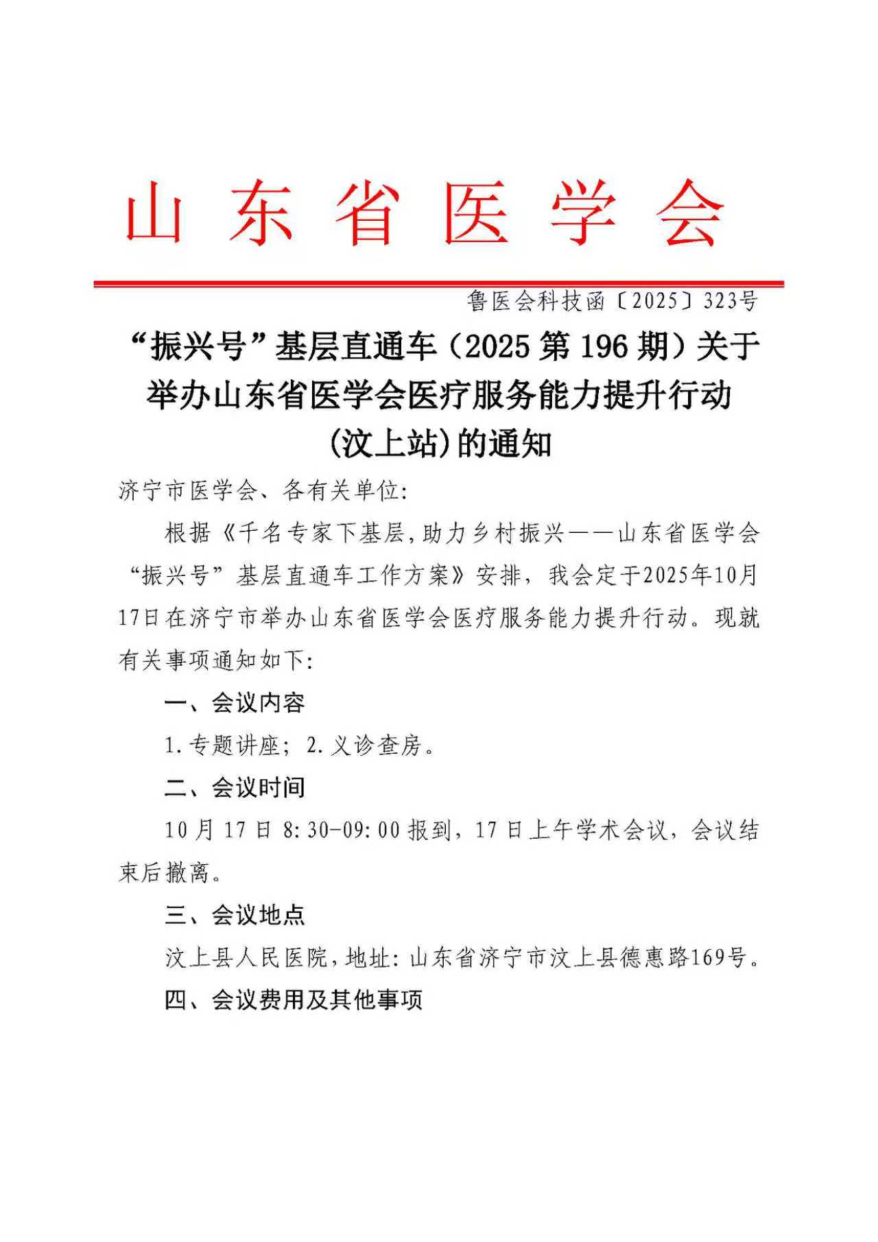 “振兴号”基层直通车(2025第196期)关于举办山东省医学会医疗服务能力提升行动(汶上站)的通知