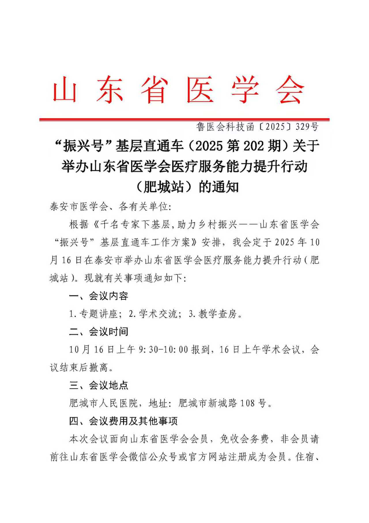 “振兴号”基层直通车(2025第第202期)关于举办山东省医学会医疗服务能力提升行动(肥城站)的通知