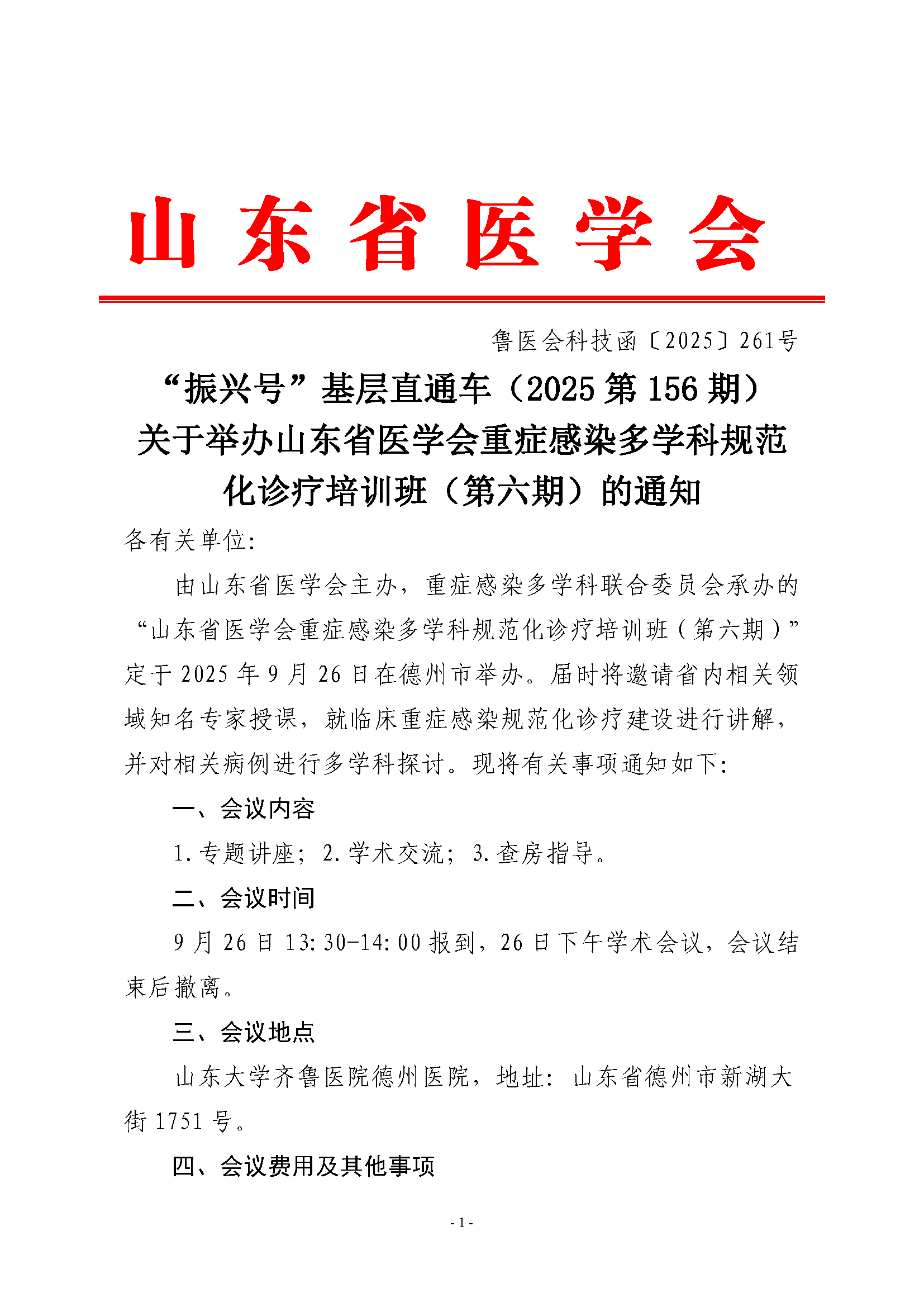 “振兴号”基层直通车(2025第156期)关于举办山东省医学会重症感染多学科规范化诊疗培训班(第六期)的通知