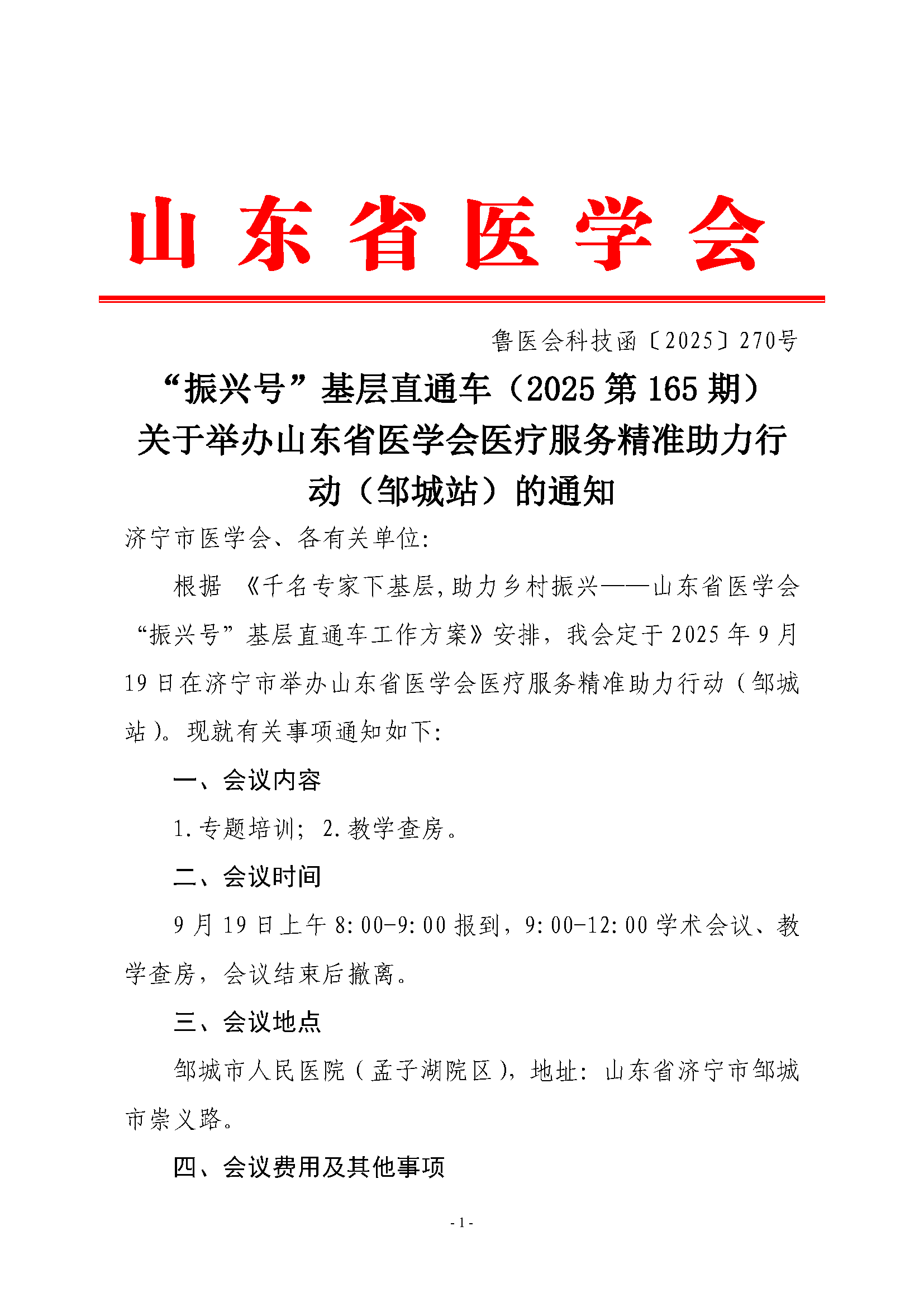 “振兴号”基层直通车(2025第165期)关于举办山东省医学会医疗服务精准助力行动(邹城站)的通知