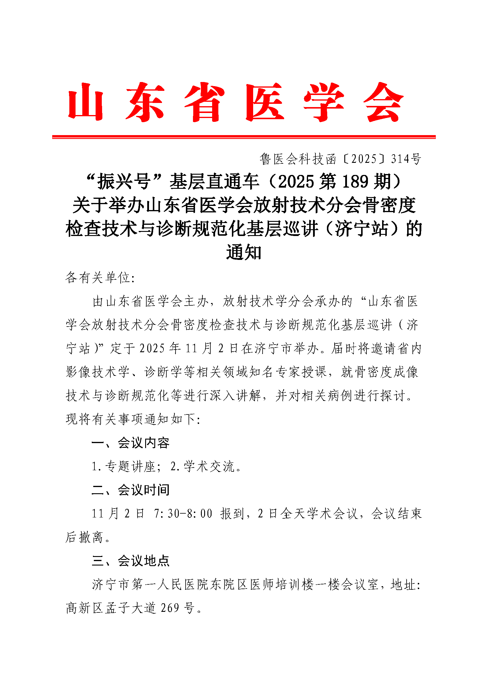 “振兴号”基层直通车(2025第189期)关于举办山东省医学会放射技术分会骨密度检查技术与诊断规范化基层巡讲(济宁站)的通知
