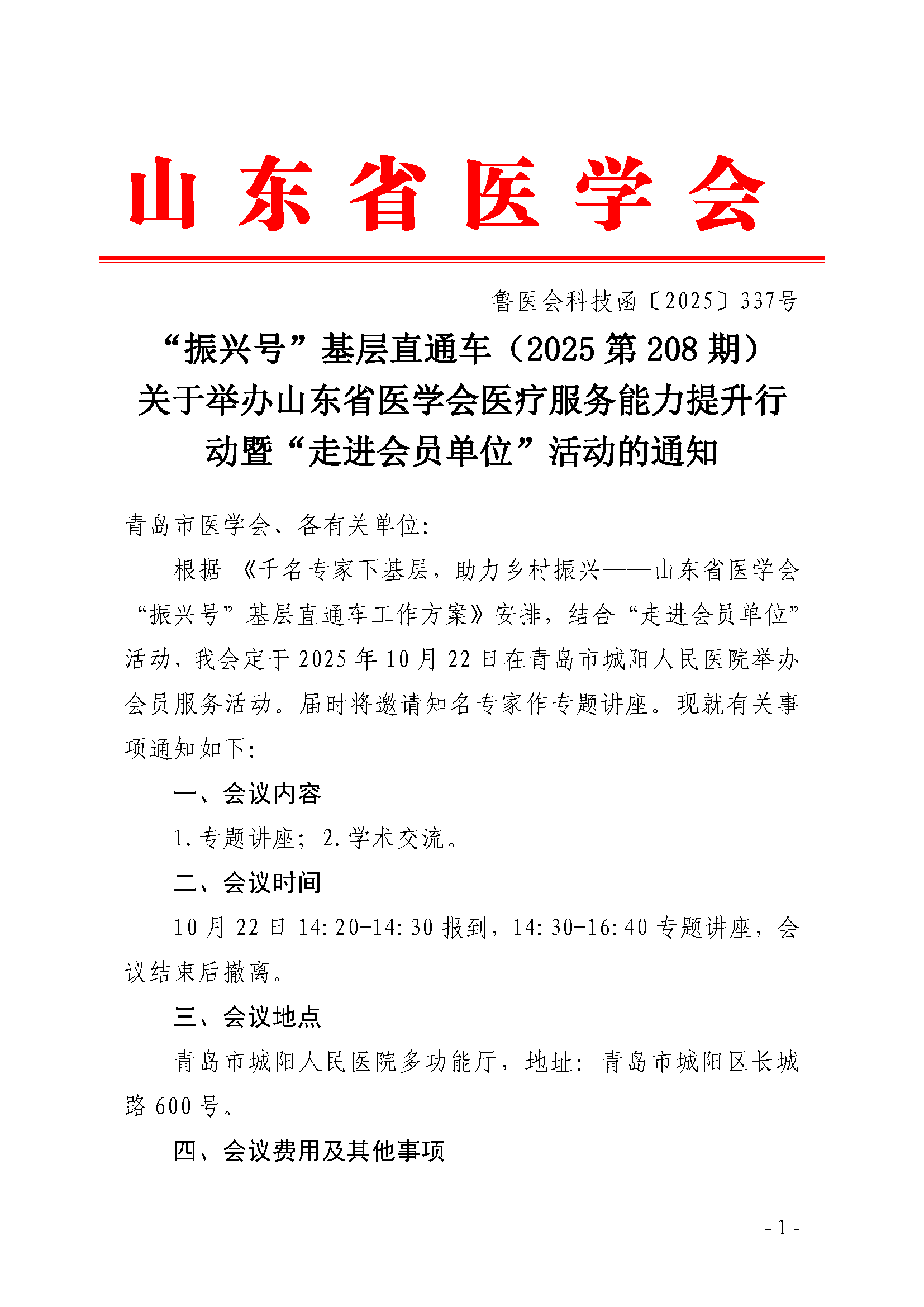 “振兴号”基层直通车(2025第208期)关于举办山东省医学会医疗服务能力提升行动暨“走进会员单位”活动的通知