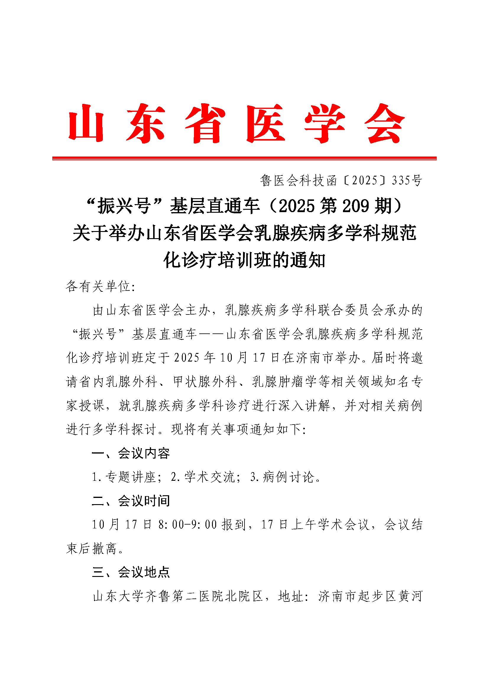 “振兴号”基层直通车(2025第209期)关于举办山东省医学会乳腺疾病多学科规范化诊疗培训班的通知