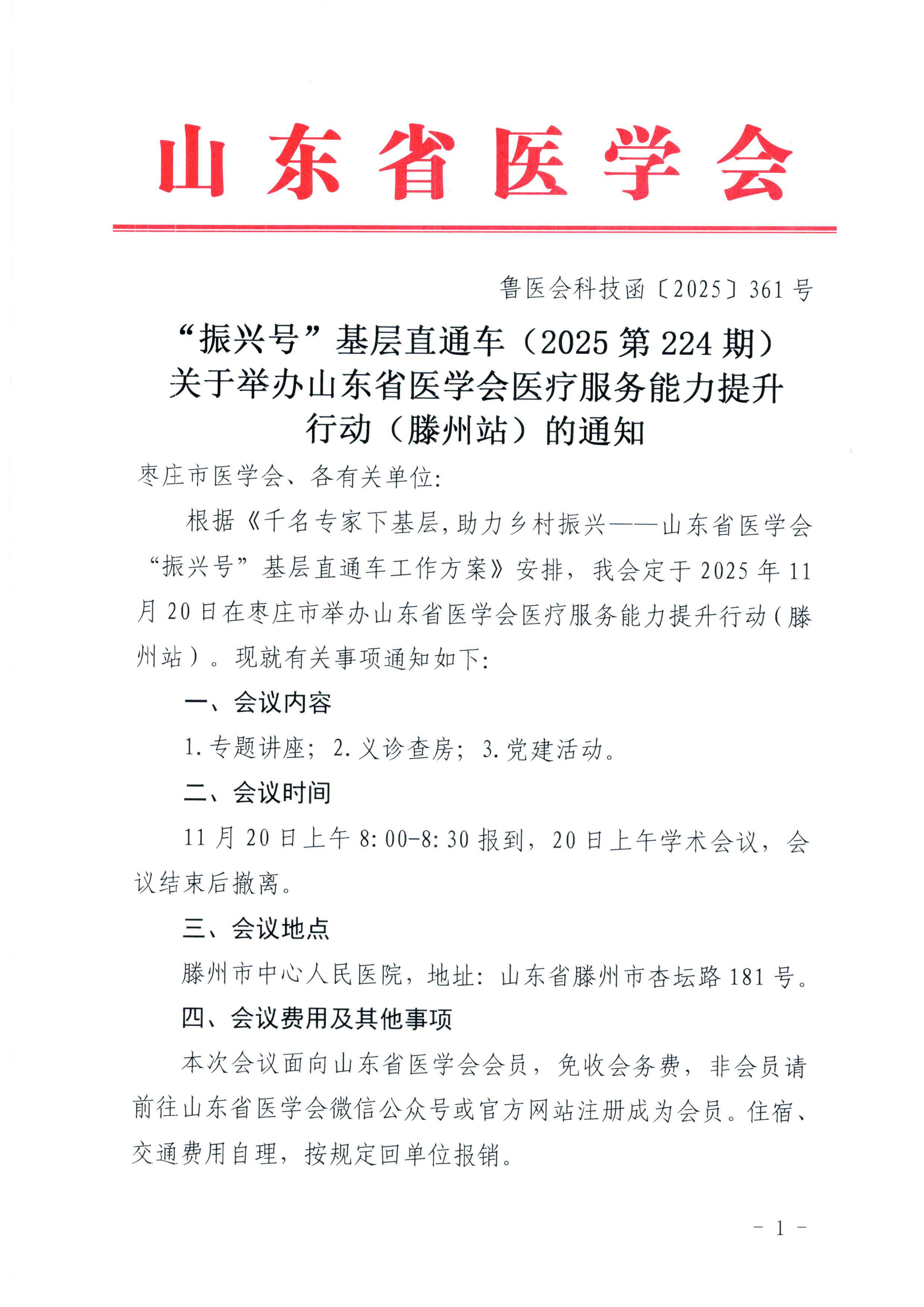 “振兴号”基层直通车(2025第224期)关于举办山东省医学会医疗服务能力提升行动(滕州站)的通知