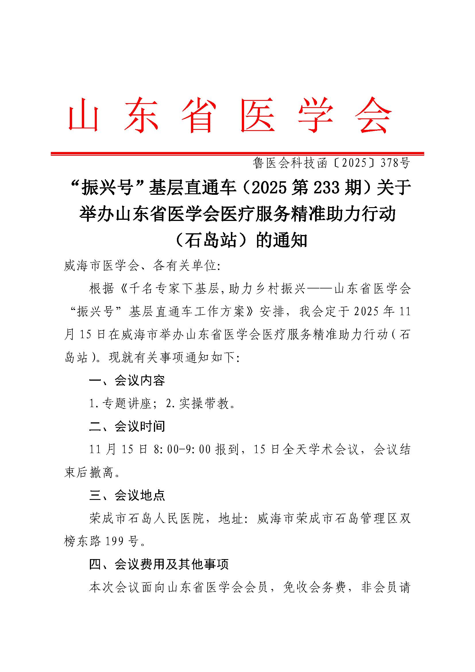 “振兴号”基层直通车(2025第233期)关于举办山东省医学会医疗服务精准助力行动(石岛站)的通知
