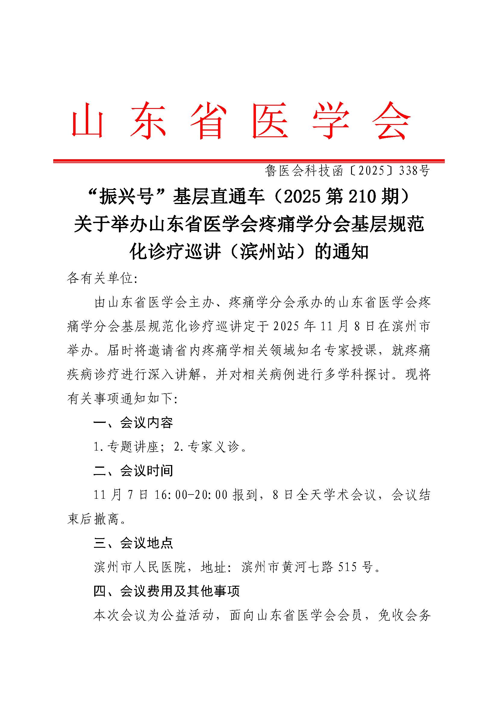 “振兴号”基层直通车(2025第210期)关于举办山东省医学会疼痛学分会基层规范化诊疗巡讲(滨州站)的通知
