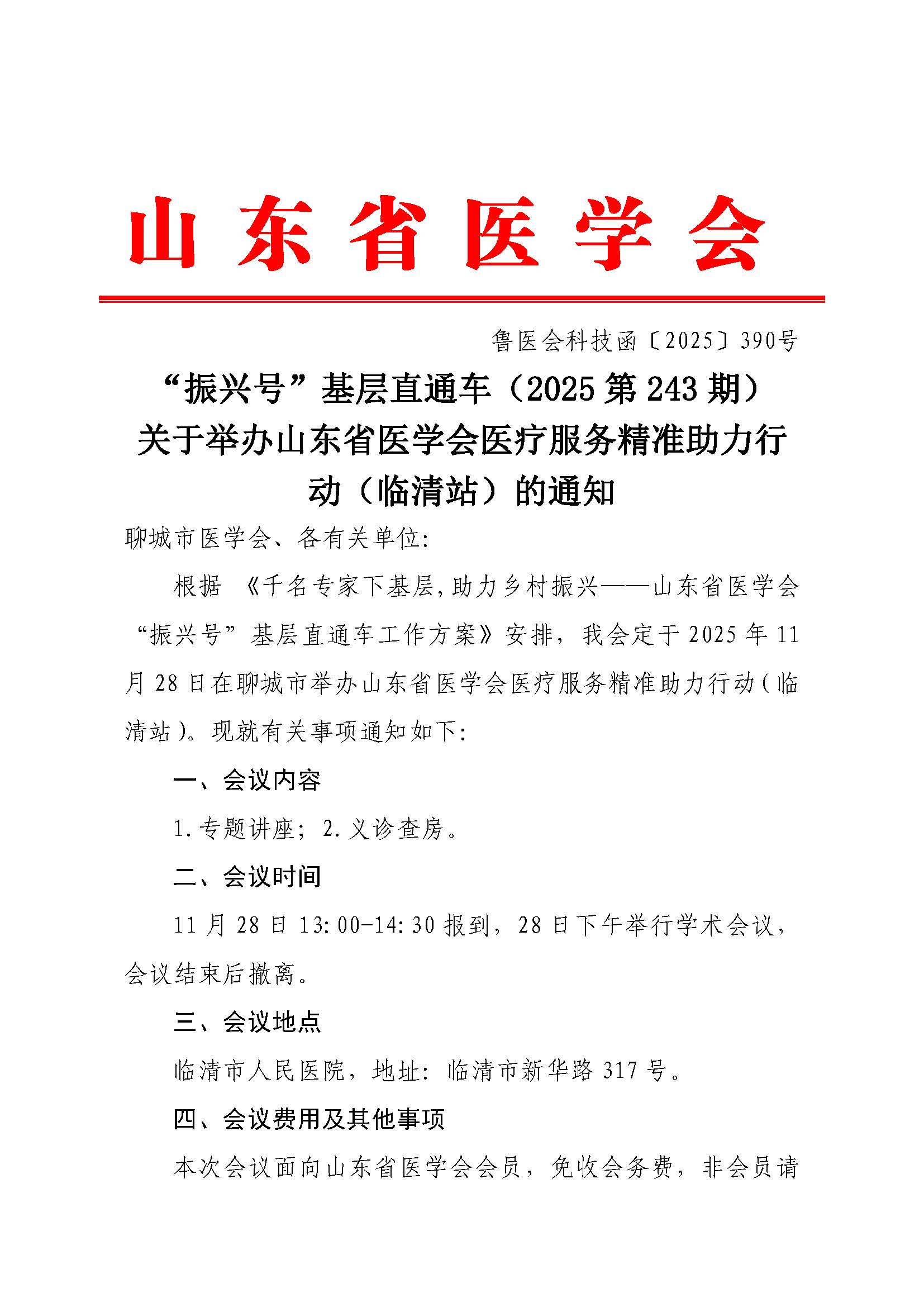 “振兴号”基层直通车(2025第243期)关于举办山东省医学会医疗服务精准助力行动(临清站)的通知