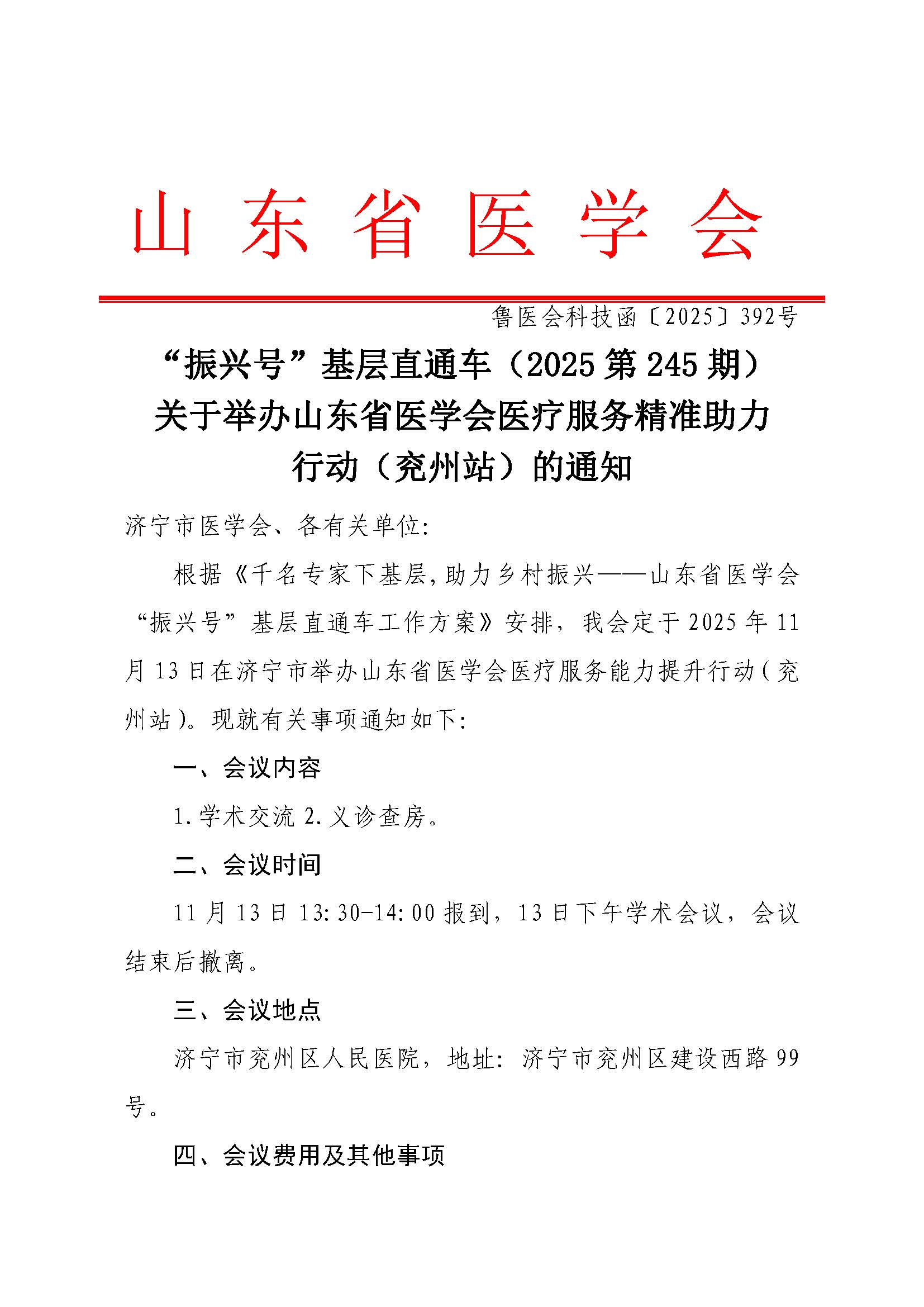 “振兴号”基层直通车(2025第245期)关于举办山东省医学会医疗服务精准助力行动(兖州站)的通知