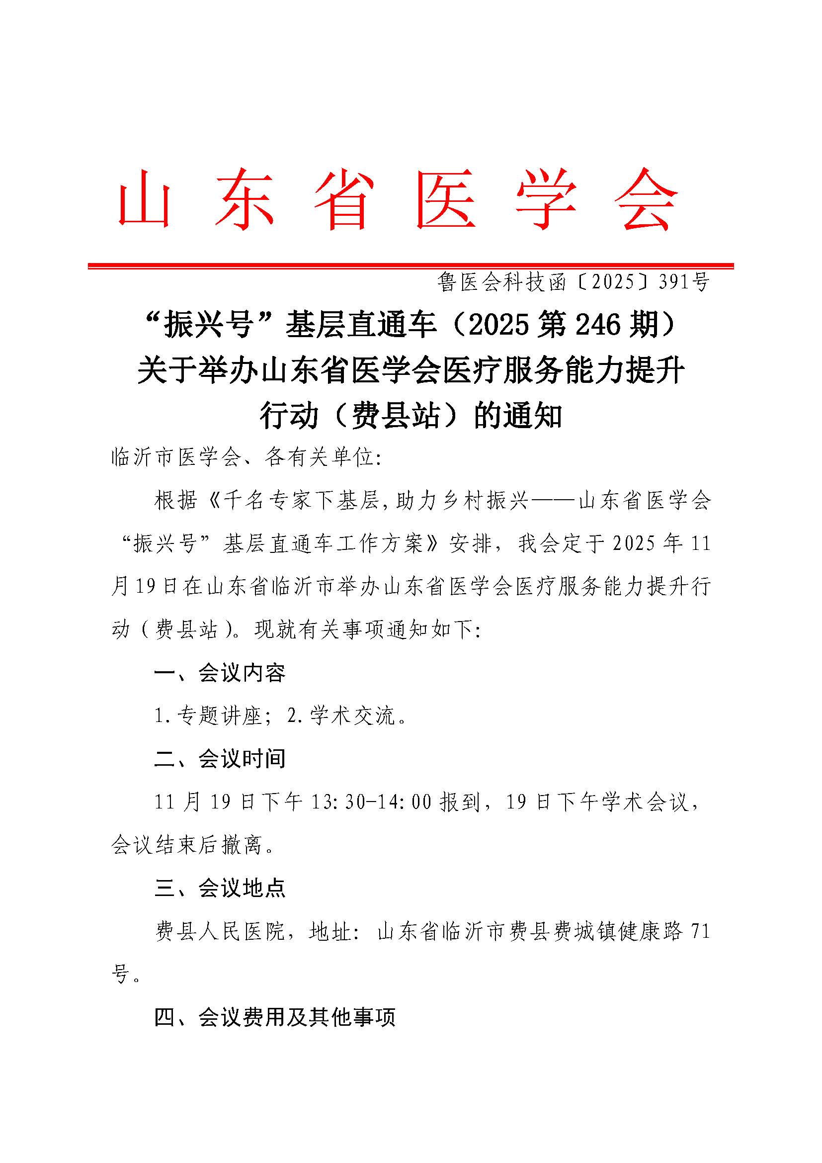“振兴号”基层直通车(2025第246期)关于举办山东省医学会医疗服务能力提升行动(费县站)的通知