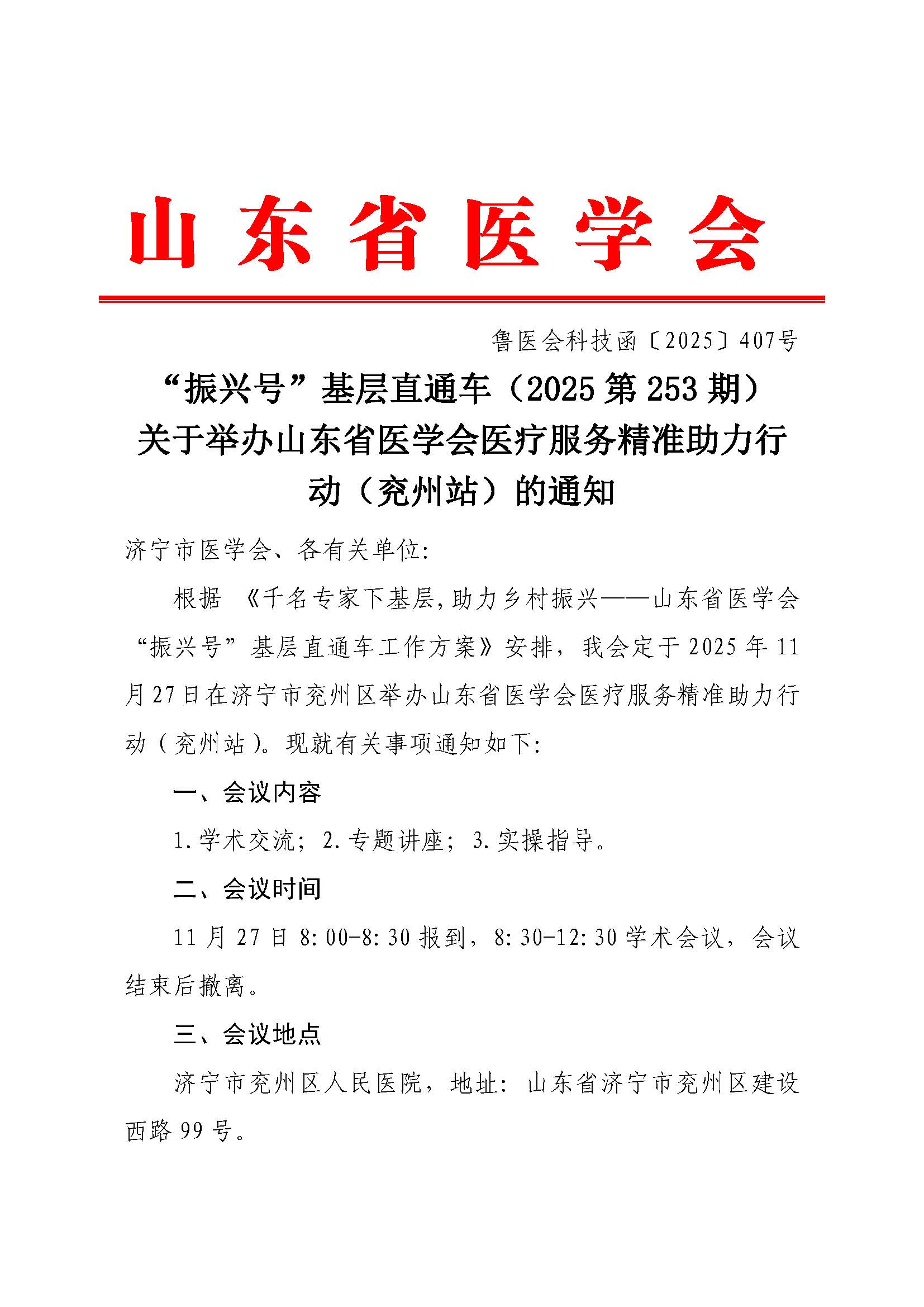 “振兴号”基层直通车(2025第253期)关于举办山东省医学会医疗服务精准助力行动(兖州站)的通知