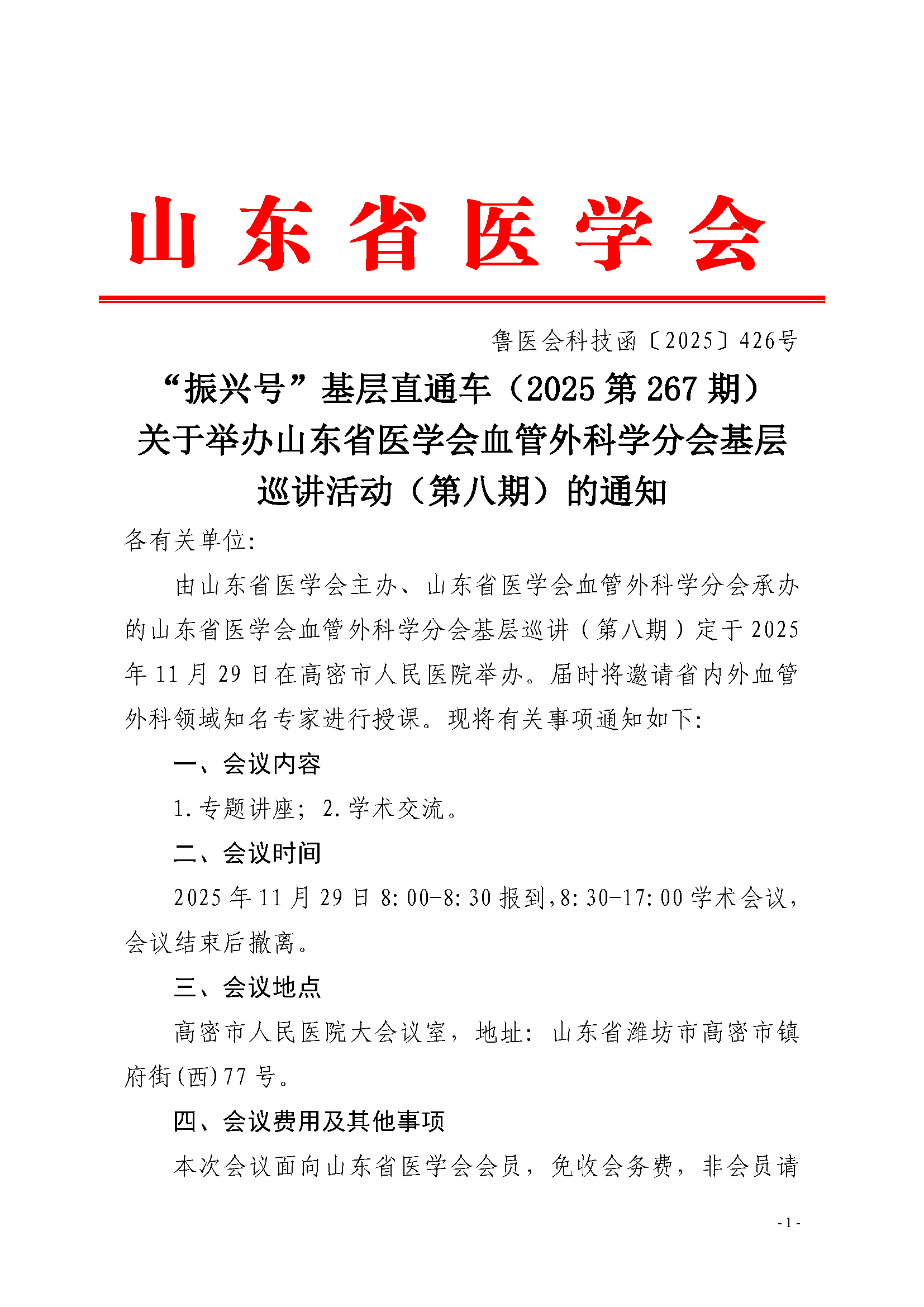 “振兴号”基层直通车(2025第267期)关于举办山东省医学会血管外科学分会基层巡讲活动(第八期)的通知