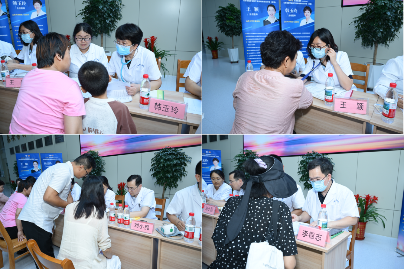 义诊活动现场,山东省医学会变态反应学分会副主任委员兼肺功能学组组长、山东大学附属儿童医院呼吸科主任韩玉玲,心血管病学分会心血管预防学组副组长、山东大学齐鲁医院心内科主任医师王颖,罕见疾病分会委员、山东第一医科大学第一附属医院神经内科主任医师刘小民,呼吸病学分会介入呼吸病学学组委员、山东第一医科大学附属省立医院呼吸内科副主任医师李德志4位省级专家,在广饶县人民医院门诊大厅开展多学科联合义诊,累计为100余名群众提供免费诊疗服务。