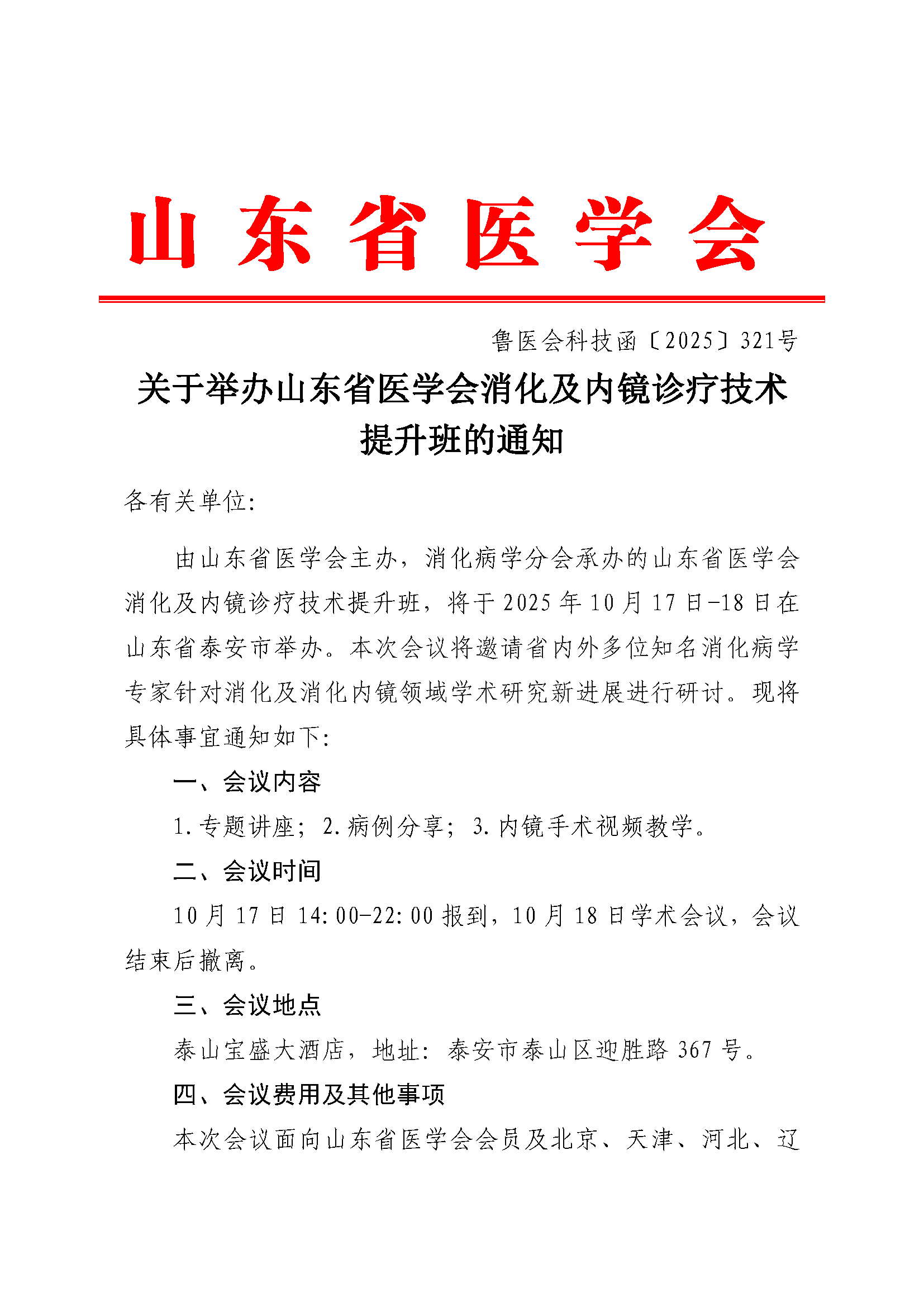 关于举办山东省医学会消化及内镜诊疗技术提升班的通知