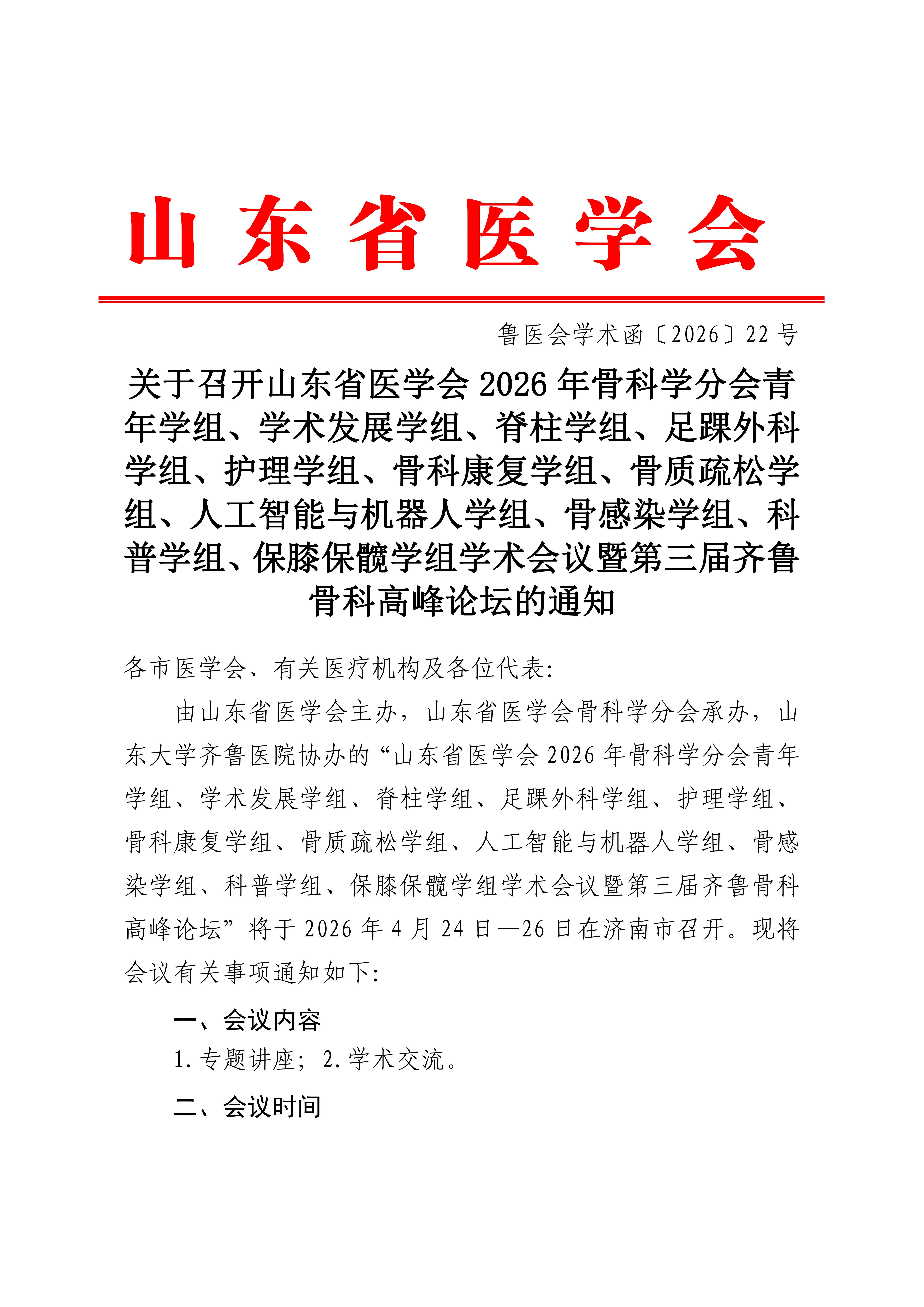 关于召开山东省医学会2026年骨科学分会青年学组、学术发展学组、脊柱学组、足踝外科学组、护理学组、骨科康复学组、骨质疏松学组、人工智能与机器人学组、骨感染学组、科普学组、保膝保髋学组学术会议暨第三届齐鲁骨科高峰论坛的通知