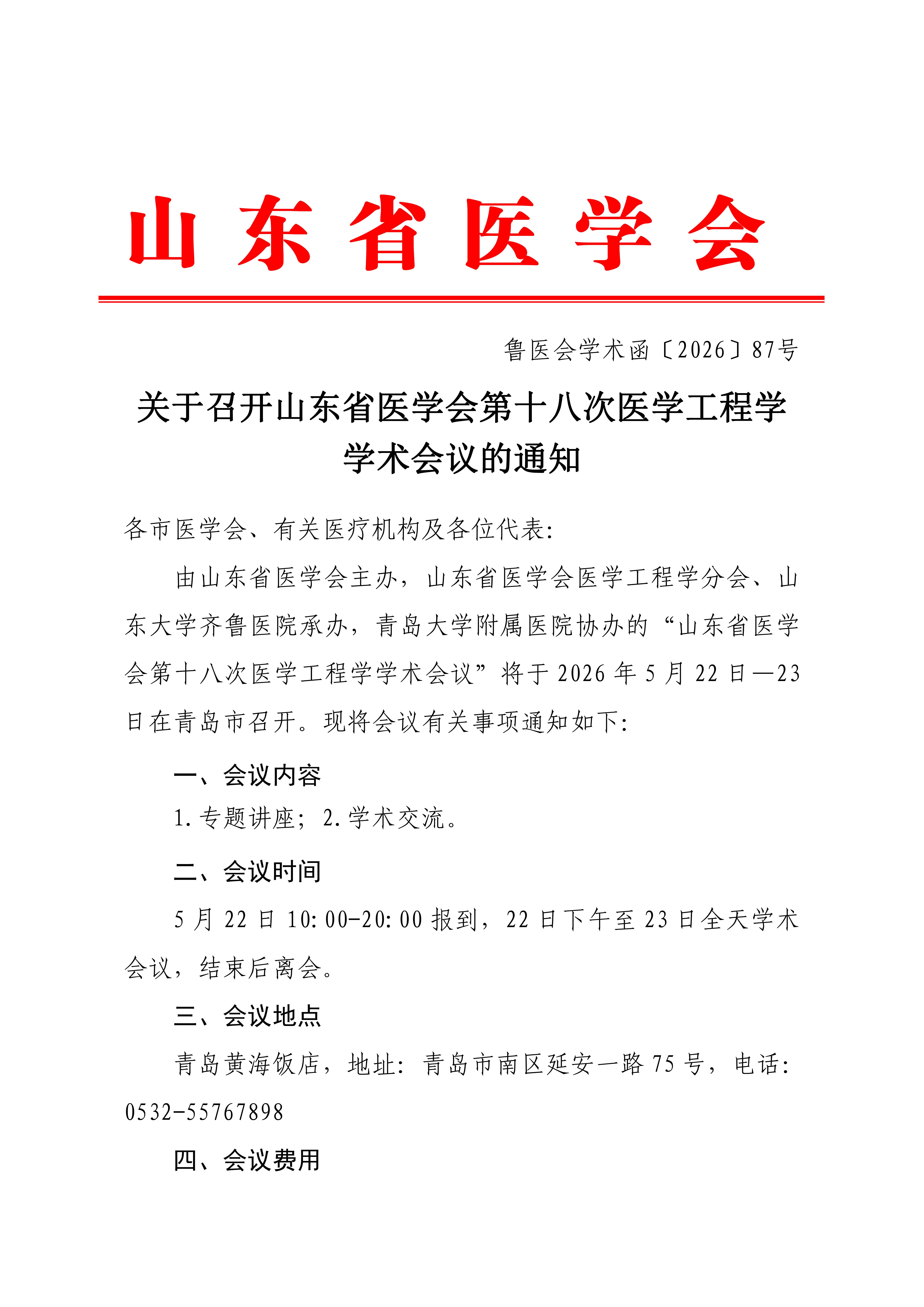 关于召开山东省医学会第十八次医学工程学术会议的通知