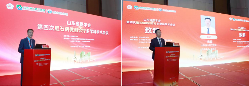山东省医学会胆石病微创诊疗多学科联合委员会主任委员张锎致欢迎词。山东省医学会胆石病微创诊疗多学科联合委员会副主任委员、山东省立第三医院肝胆外科冯宪光主持开幕式。