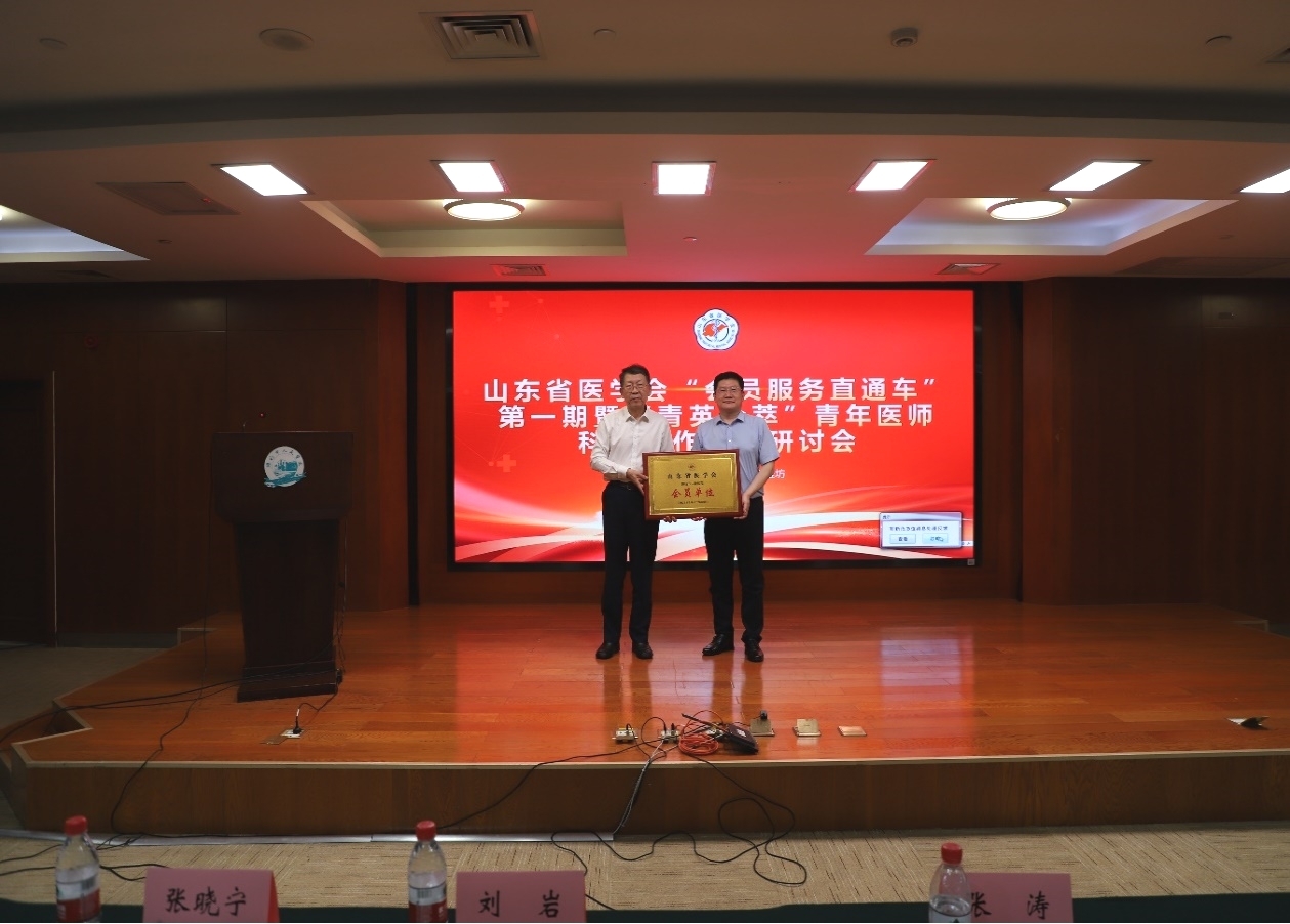 研讨会现场刘岩监事长为潍坊人民医院颁发“山东省医学会会员单位”牌匾。
